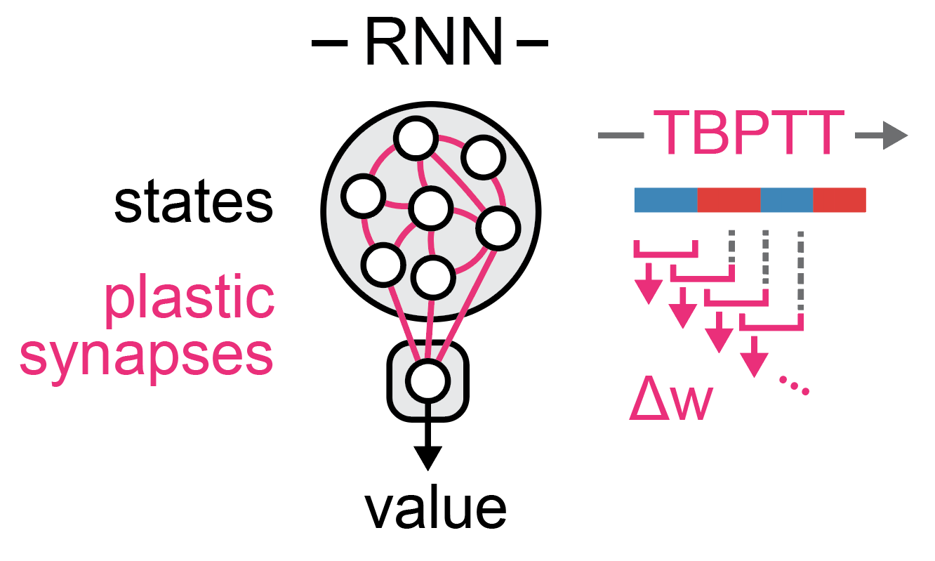 We show that meta-learning in value computataion emerges through a transition from plasticity-based value update to recurrent dynamics-based value update. We developped a new RNN implementation with an online learning rule (T-BPTT) which mimics mouse behavior and display meta-learning via a transition from plasticity to dynamics-based value update. This transition to dynamics-based value allow both RNNs and mice to infer value using structural knowledge.